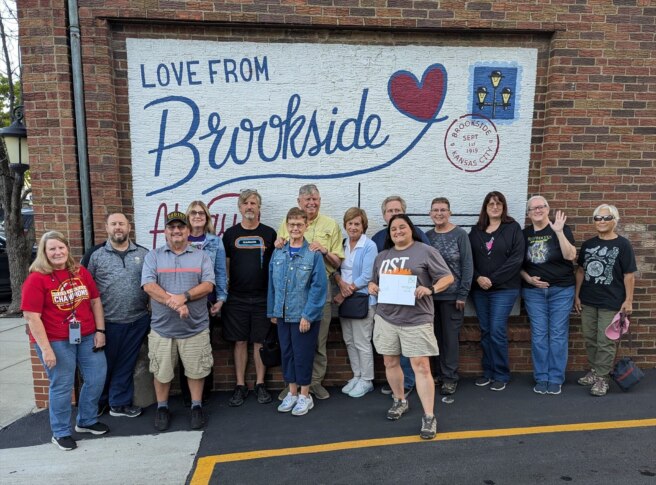 W Brookside w stanie Missouri geocacherzy spotkali się przed muralem w formie pocztówki, aby uczcić Światowy Dzień Pocztówki 2024 – to bardzo odpowiednie miejsce na to wydarzenie. Zdjęcie: javthrowr.